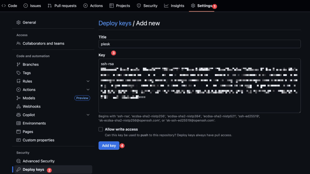 - Go to Settings → Security → Deploy keys.